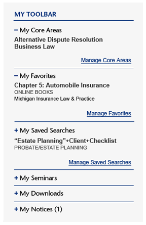 My Toolbar—personalized controls to designate, store, and quickly access your registrations, favorites, downloads, and more. "My Favorites" gives quick access to resources you've designated as your favorites. Quickly rerun searches with "My Saved Searches."